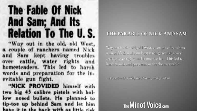On this day in 1791, we began the practice of amending our constitution to better serve and protect us from ourselves. In 1890, that protection had not yet been extended to Native Americans, particularly one individual on the prairie. In 1961, justice finally arrived to collect one notorious Nazi. In 1960 Minot, the B-52s were coming, high school debate was front page news, edible history was worth reading, and the parable of Nick and Sam offers us an uncomfortable comparison to America in our own time.
