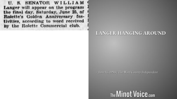 U.S. Senator William Langer will appear on the program the final day, Saturday, June 25, of Rolette's Golden Anniversary festivities, according to word received by the Rolette Commercial Club.