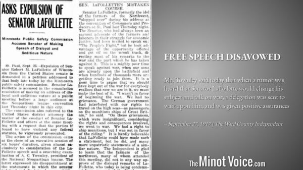 Senator LaFollette was free to say what thought, but he was not free from the consequences of it. And the then-young NPL party (a party whose ideas were considered radical (by some) in their day) was quick to say, “that guy isn’t with us.”