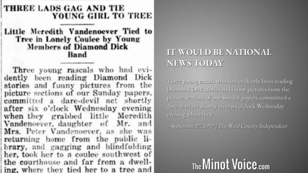 Three young rascals who had evidently been reading Diamond Dick stories and funny pictures from the picture sections of our Sunday papers, committed a dare-devil act shortly after six o’clock Wednesday evening when they grabbed little Meredith Vandenoever, daughter of Mr. and Mrs. Peter Vandenoever, as she was returning home from the public library, and gagging and blindfolding her, took her to a coulee southwest of the courthouse and far from a dwelling, where they tied her to a tree and left her.