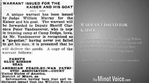 A unique warrant has been issued by Judge William Murray for the Kaiser and his goat. The warrant will be forwarded to Deputy Sheriff Clarence Peter Vandenoever, who is now in training camp at Camp Dodge, Iowa. As Mr. Vandenoever is recognized as a “go-getter,” having never yet failed to get his man, it is presumed that he will deliver the goods.