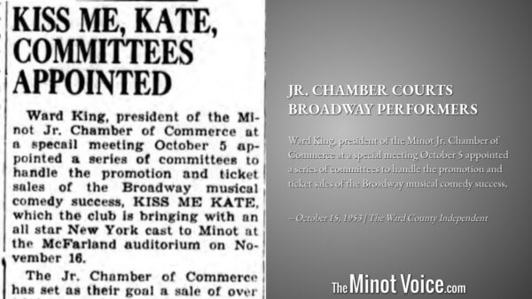 Ward King, president of the Minot Jr. Chamber of Commerce at a special meeting October 5 appointed a series of committees to handle the promotion and ticket sales of the Broadway musical comedy success, KISS ME KATE, which the club is bringing with an all star New York cast to Minot at the McFarland auditorium on November 16.
