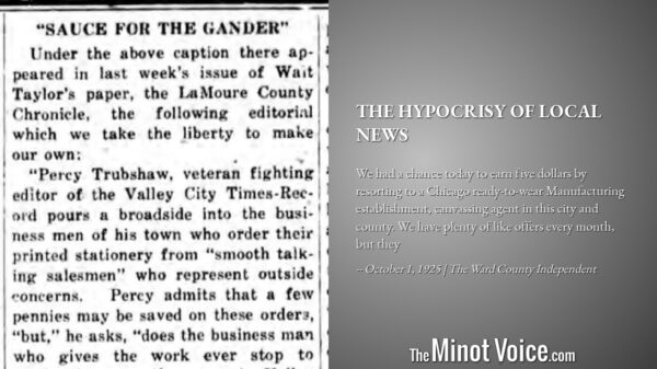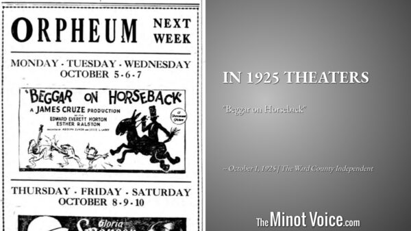 On this day in 1908, Henry Ford and personal transportation down to a “t”. In 1961, the establishing of the DIA put the intelligence in national defense, and in 1989, Denmark led the world in recognizing a new human right. One hundred years ago in Minot, we were measuring the full cost of out-migration, high-value cargo was rolling through town, the local news was doing the right thing when it came to local advertising, but no one was giving them credit, and snow was just across the border.
