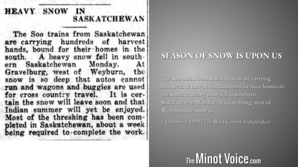 The Soo trains from Saskatchewan are carrying hundreds of harvest hands, bound for their homes in the south. A heavy snow fell in southern Saskatchewan Monday. At Gravelburg, west of Weyburn, the snow is so deep that autos cannot run and wagons and buggies are used for cross country travel. It is certain the snow will leave soon and that Indian summer will yet be enjoyed. Most of the threshing has been completed in Saskatchewan, about a week being required to complete the work.
