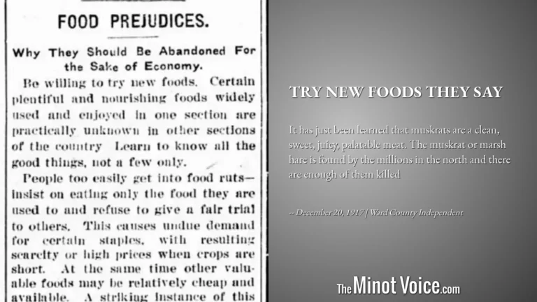 It has just been learned that muskrats are a clean, sweet, juicy, palatable meat. The muskrat or marsh hare is found by the millions in the north and there are enough of them killed in Ward county every winter to keep hundreds[...]