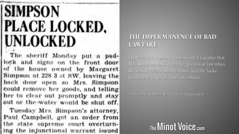 District court jury term opened in Minot Monday with the first case on the docket being a civil case in which the state sued to enjoin Mrs. Mary Jackson to close the Parrot Inn [...]Read More... from On This Day | Harassing[...]