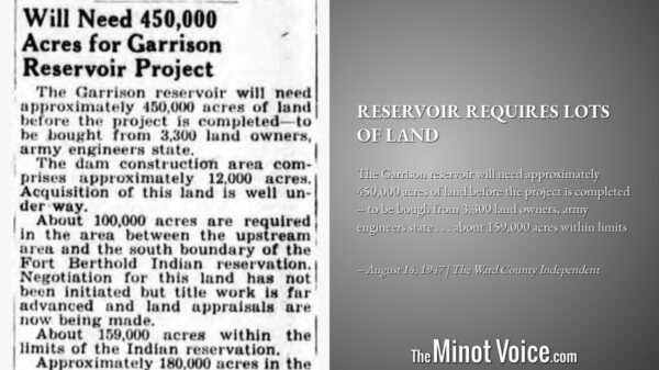 The Garrison reservoir will need approximately 450,000 acres of land before the project is completed -- to be bough from 3,300 land owners, army engineers state . . . about 159,000 acres within limits [...]Read More... from On This Day | Reservoir[...]