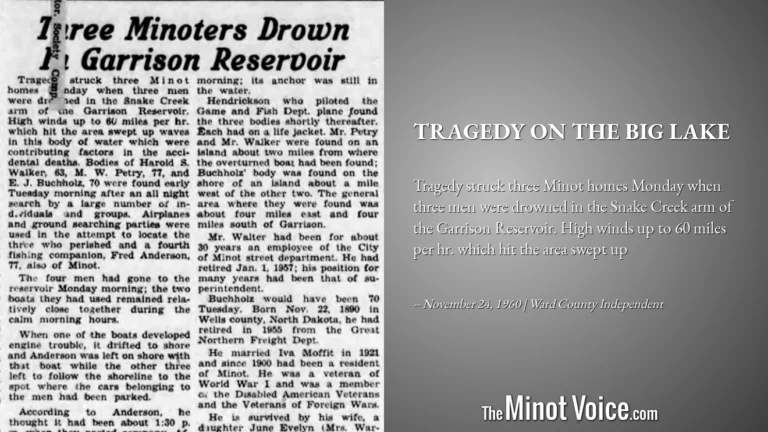 Tragedy struck three Minot homes Monday when three men were drowned in the Snake Creek arm of the Garrison Reservoir. High winds up to 60 miles per hr. which hit the area swept up [...]Read More... from On This Day | Tragedy[...]
