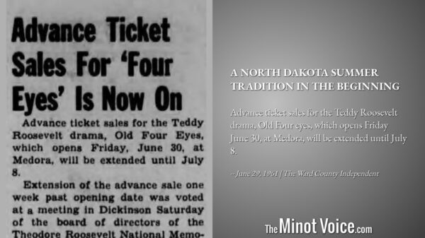 Advance ticket sales for the Teddy Roosevelt drama, Old Four eyes, which opens Friday June 30, at Medora, will be extended until July 8. [...]Read More... from On This Day | A North Dakota Summer Tradition in the Beginning