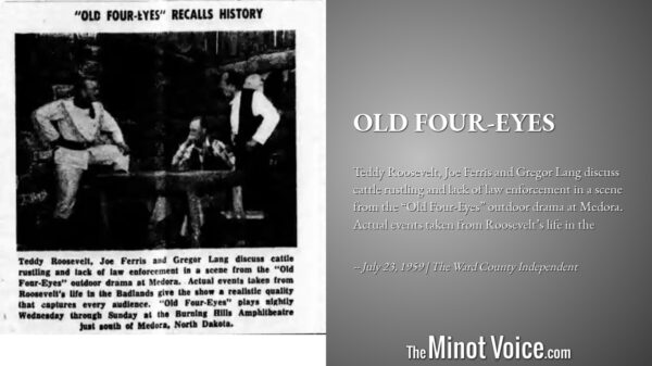 Teddy Roosevelt, Joe Ferris and Gregor Lang discuss cattle rustling and lack of law enforcement in a scene from the “Old Four-Eyes” outdoor drama at Medora. Actual events taken from Roosevelt’s life in the [...]Read More... from On This Day | Old[...]