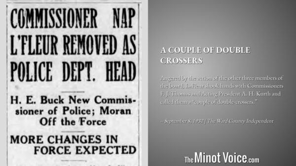 Angered by the action of the other three members of the board, LaFleur shook hands with Commissioners F. J. Thomas and Acting President A. H. Kurth and called them a “couple of double-crossers.” -- September 8, 1932 | The Ward County Independent[...]