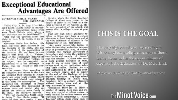 That any high school graduate residing in Minot may have a college education without leaving home and at the very minimum of expense, is the declaration of Dr. McFarland. [...]Read More... from On This Day | This is the Goal
