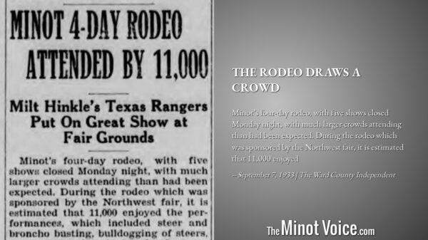 Minot’s four-day rodeo, with five shows closed Monday night, with much larger crowds attending than had been expected. During the rodeo which was sponsored by the Northwest fair, it is estimated that 11,000 enjoyed [...]Read More... from On This Day | The[...]