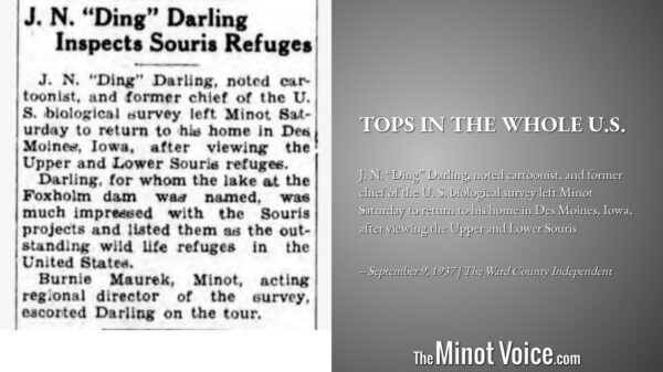 J. N. “Ding” Darling, noted cartoonist, and former chief of the U. S. biological survey left Minot Saturday to return to his home in Des Moines, Iowa, after viewing the Upper and Lower Souris [...]Read More... from On This Day | Tops[...]