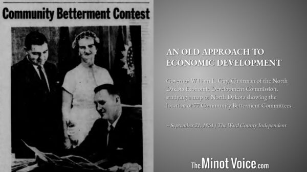 Governor William L. Guy, Chairman of the North Dakota Economic Development Commission, studying a map of North Dakota showing the location of 77 Community Betterment Committees. [...]Read More... from On This Day | An Old Approach to Economic Development