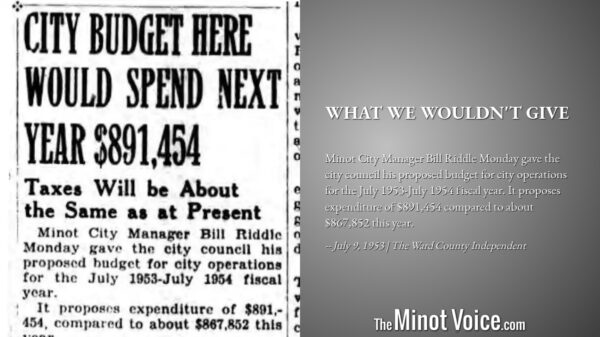 Minot City Manager Bill Riddle Monday gave the city council his proposed budget for city operations for the July 1953-July 1954 fiscal year. It proposes expenditure of $891,454 compared to about $867,852 this year. [...]Read More... from On This Day | What[...]