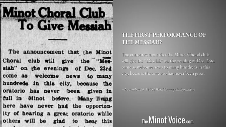 The announcement that the Minot Choral club will give the “Messiah” on the evening of Dec. 23rd come as welcome news to many hundreds in this city, because the oratorio has never been given in full in Minot before. Many living here[...]