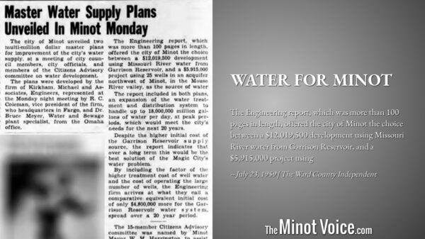 The Engineering report, which was more than 100 pages in length, offered the city of Minot the choice between a $12,019,500 development using Missouri River water from Garrison Reservoir, and a $5,915,000 project using [...]Read More... from On This Day | Water[...]